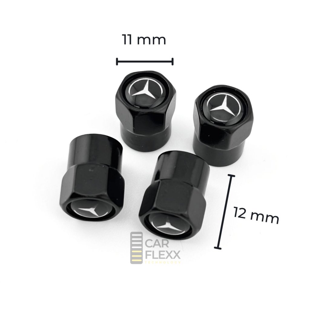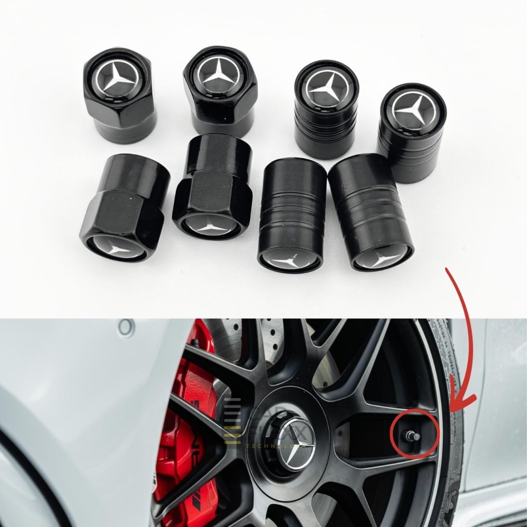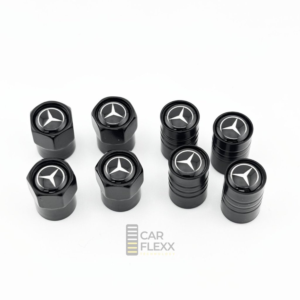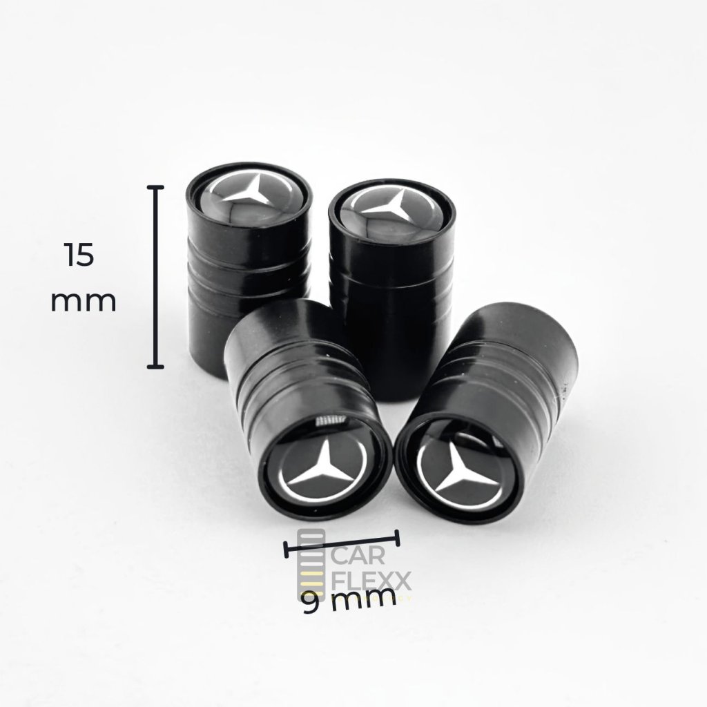 Malý detail s velkým efektem – černé kovové ventilky s logem Mercedes-Benz dodají kolům exkluzivní vzhled a profesionální ochranu. 🖤
