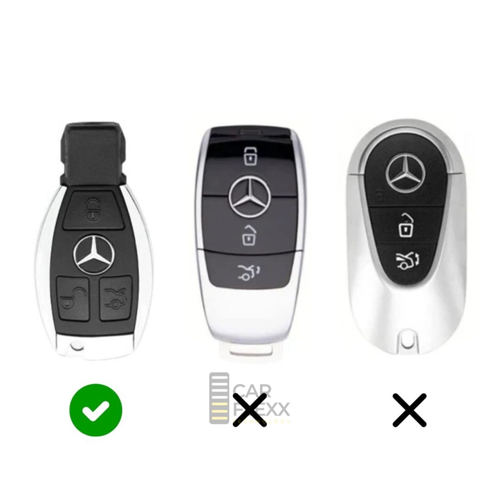 Součástí je také praktická kovová karabina pro snadné připevnění ke klíčence, tašce či poutku kalhot. Pouzdro přesně padne na klíče Mercedes-Benz používané v letech 2007–2017 – doporučujeme porovnat tvar a rozložení tlačítek podle fotografií.
