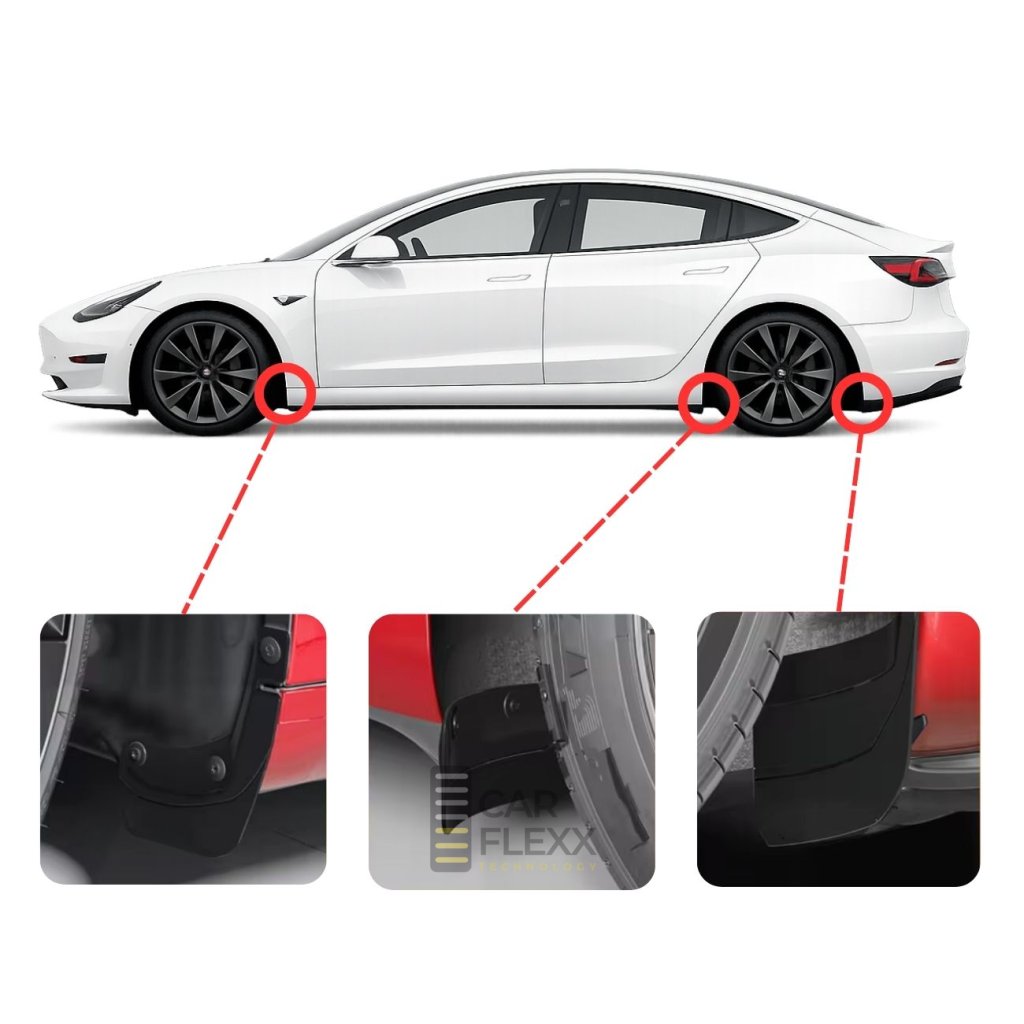 Majitelé Tesla Model 3 (2018–2023) často řeší poškození laku v oblasti prahů způsobené odletujícími kamínky. Naše sada 6ks lapačů nečistot nabízí rozšířenou ochranu díky pokrytí přední i zadní strany kol. Použitý flexibilní TPE materiál zůstává ohebný i v extrémních mrazech, neláme se při kontaktu s překážkou a díky své měkkosti nezpůsobuje oděrky na laku v místě dotyku.