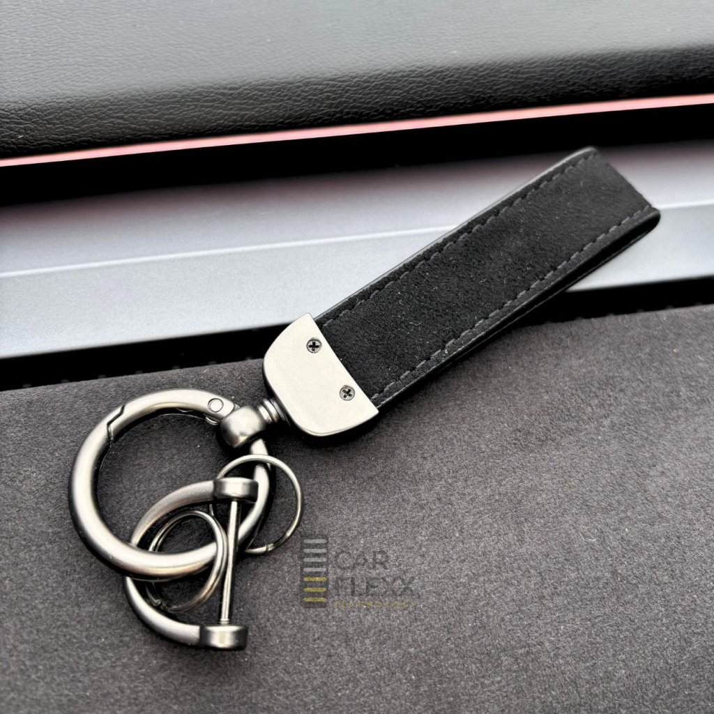 Součástí setu je prémiová klíčenka Tesla s pevnou kovovou karabinou v tmavém provedení, která plynule přechází do černého alcantarového / semišového poutka. Jemné černé prošívání a laserově gravírované logo Tesla dodávají klíčence luxusní a nadčasový vzhled.